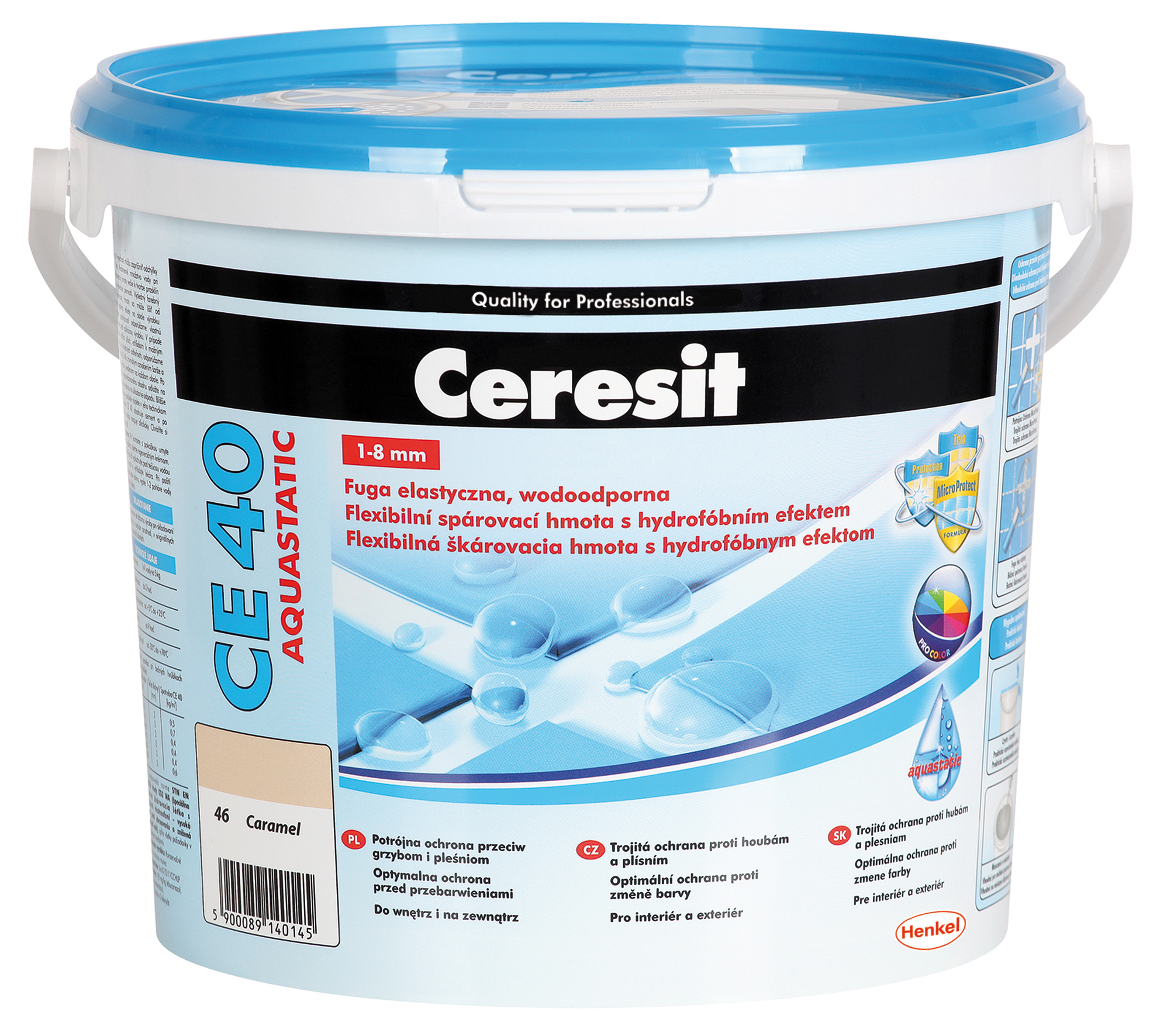 CERESIT fuga elastyczna do płytek CE 40 - 2 kg, 1-8 mm - zaprawa Ceresit CE 40 służy do spoinowania płytek gresowych, innych typów płytek ceramicznych, szklanych oraz kamiennych (również marmurów), zarówno na powierzchniach pionowych i poziomych. Potrójna Ochrona MicroProtect – formuła zawiera 3 specjalnie dobrane substancje czynne, które zapewniają długą i skuteczną ochronę przeciw grzybom i pleśniom. Formuła chroni nie tylko samą spoinę, lecz również przyległe do niej powierzchnie płytek (strefa inhibicji), zapewniając estetyczny wygląd okładziny ceramicznej. Efekt Aquastatic – powierzchniowe uszczelnienie spoiny (hydrofobizacja) powoduje, że krople wody utrzymują się w formie perełek na powierzchni fugi, co wydłuża znacząco działanie pleśniobójcze oraz chroni fugę przed zabrudzeniami. Zalety te umożliwiają eksploatacje spoiny w miejscach szczególnie narażonych na okresowe działanie wody np. łazienki, prysznice, kuchnie. Może być stosowana wewnątrz i na zewnątrz budynków. Szczególnie polecana, gdy płytki mocowane są na podłożach odkształcalnych: ogrzewane podłogi, płyty wiórowe i gipsowo-kartonowe. Wodoszczelność i odporność na oddziaływanie chemikaliów zapewnia stosowanie fugi Ceresit: CE 79. Dylatacje między płytkami, spoiny w narożach ścian, w połączeniach ścian z posadzką i przy urządzeniach sanitarnych należy wypełnić silikonem Ceresit CS 25 MicroProtect, a w przypadku spoinowania marmurów CS 29. W celu dodatkowego zabezpieczenia spoin i okładzin ceramicznych przed zabrudzeniami poprzez hydrofobizację, należy stosować silikonowy impregnat Ceresit CT 10.